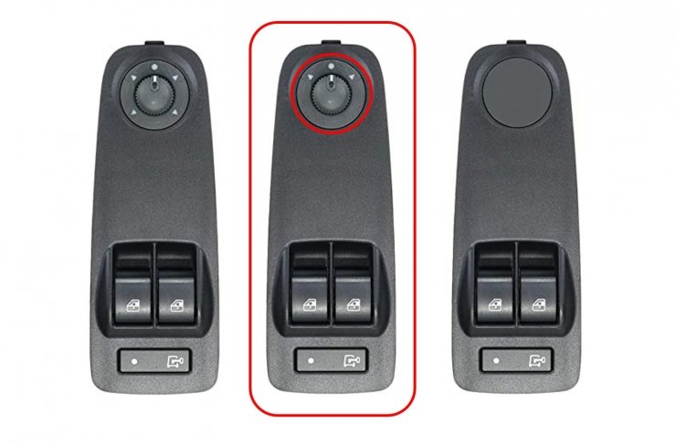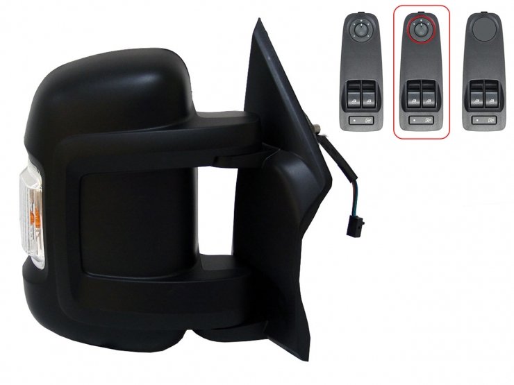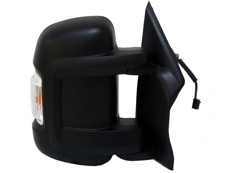 Completo. Cor preta e vidro convexo. Espelho retrovisor de ângulo morto. Térmico. Braço curto. Com indicador luminoso W16W. Conector de 6 pinos.