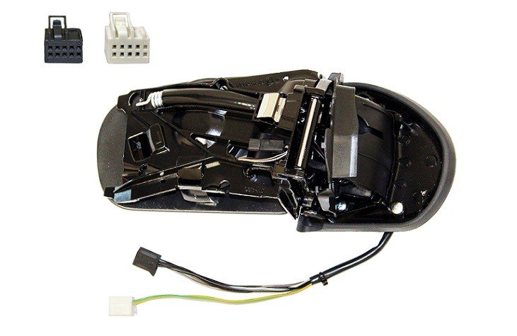 Cabo longo. Corpo do espelho com espelho asférico (ponto cego), sem capa. Ajuste interno elétrico, térmico, dobrável eletricamente. Conector de 9 pinos.